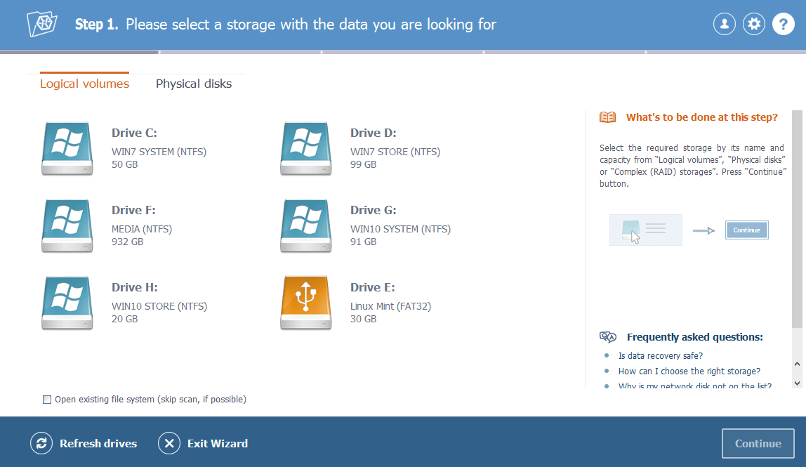 A continuación, presione el botón Continuar. Y espere hasta que el software realice el escaneo de la unidad.